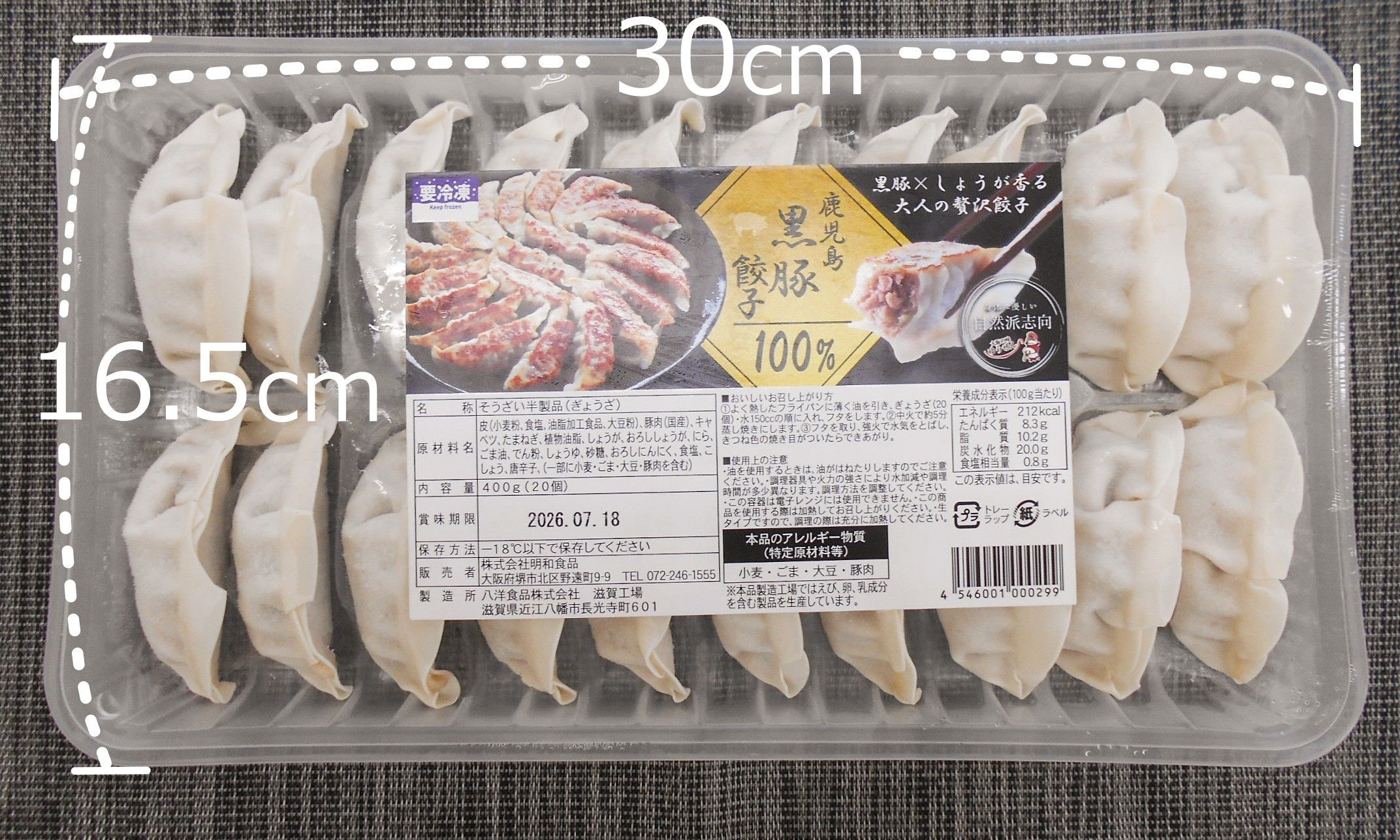 | 原材料 | 皮(小麦粉、食塩、油脂加工食品、大豆粉)、豚肉(国産)、キャベツ、たまねぎ、植物油脂、しょうが、おろししょうが、にら、ごま油、でん粉、しょうゆ、砂糖、おろしにんにく、食塩、こしょう、唐辛子、(一部に小麦・ごま・大豆・豚肉を含む) |